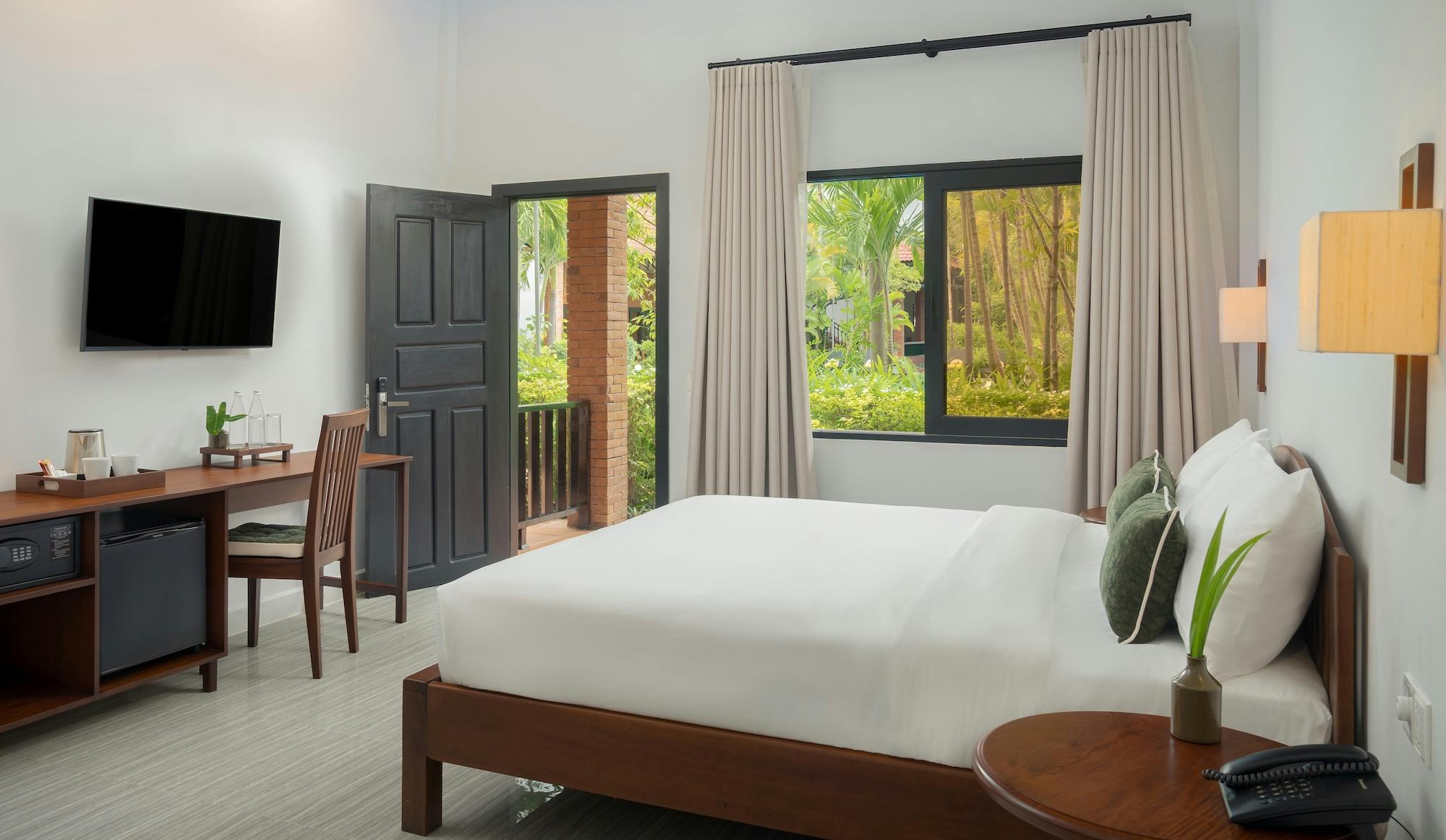 The Deluxe Double room features a comfortable double bed and a sofa bed, offering flexibility for an additional guest. Designed with natural textures and warm, neutral tones, the room feels calm and inviting. Thoughtful touches and soft lighting create a relaxing space to unwind after a busy day